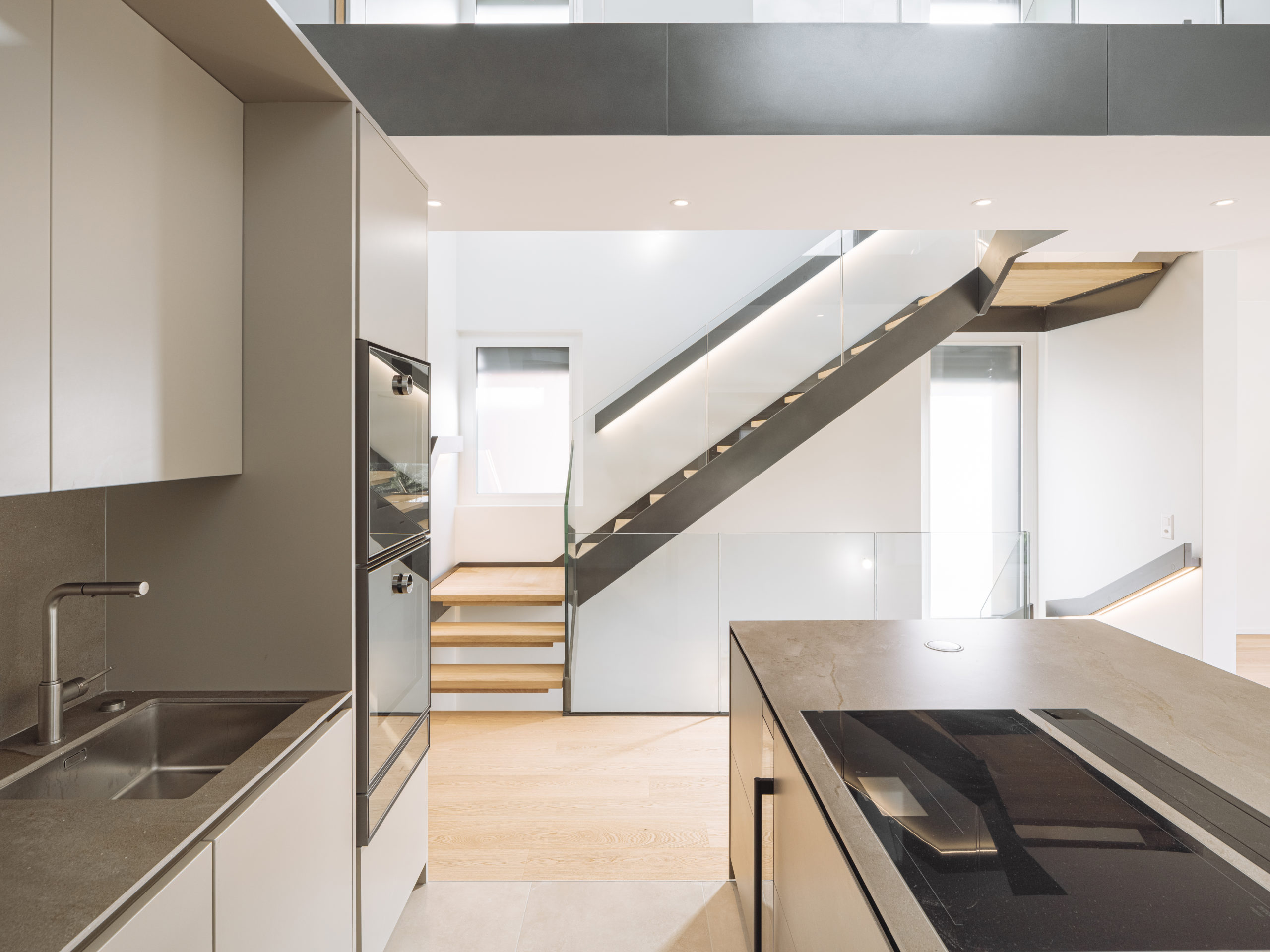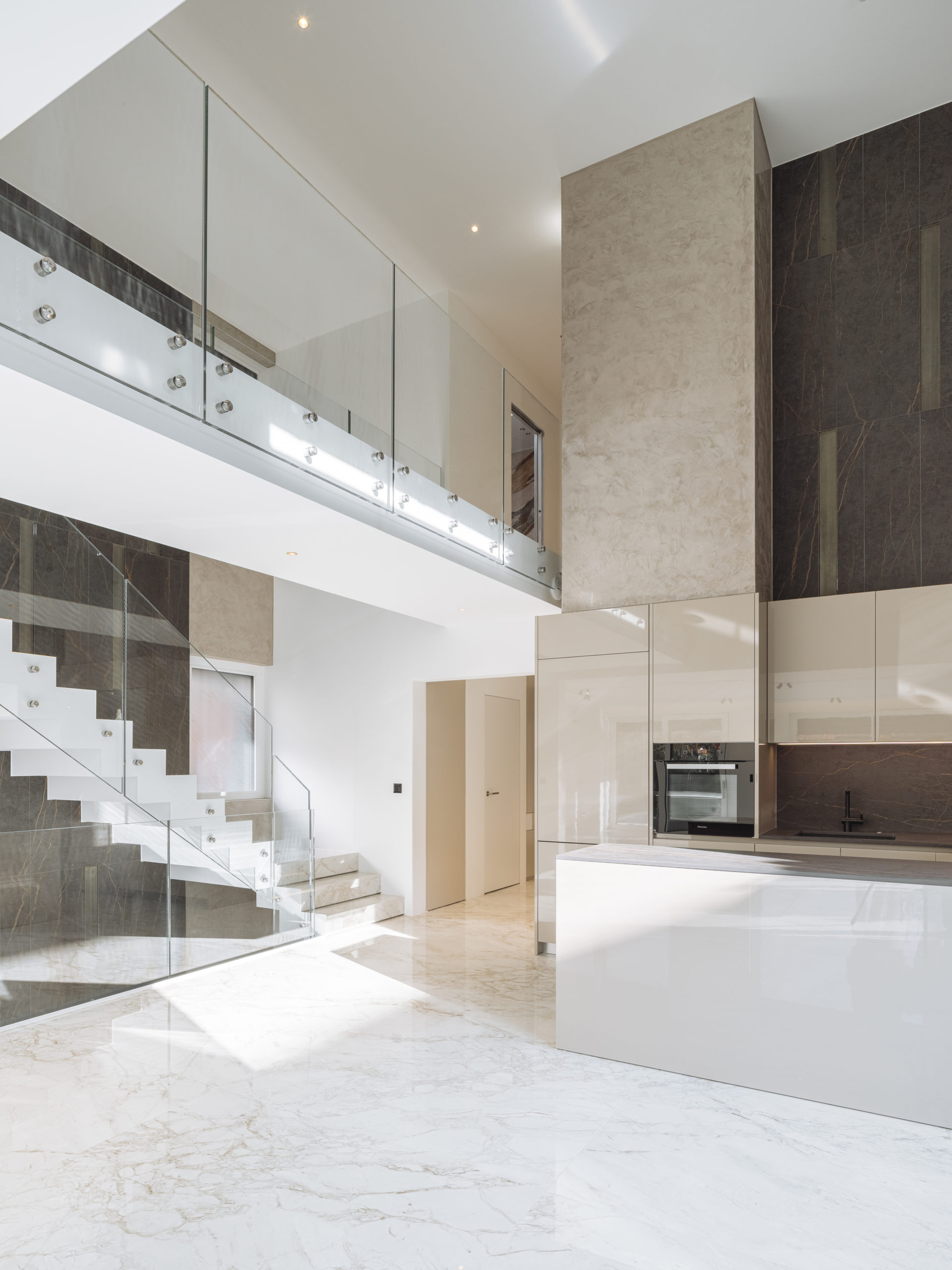 Jeux de double hauteur sur la pièce de vie et puits de lumière à travers les escaliers sur 3 niveaux.