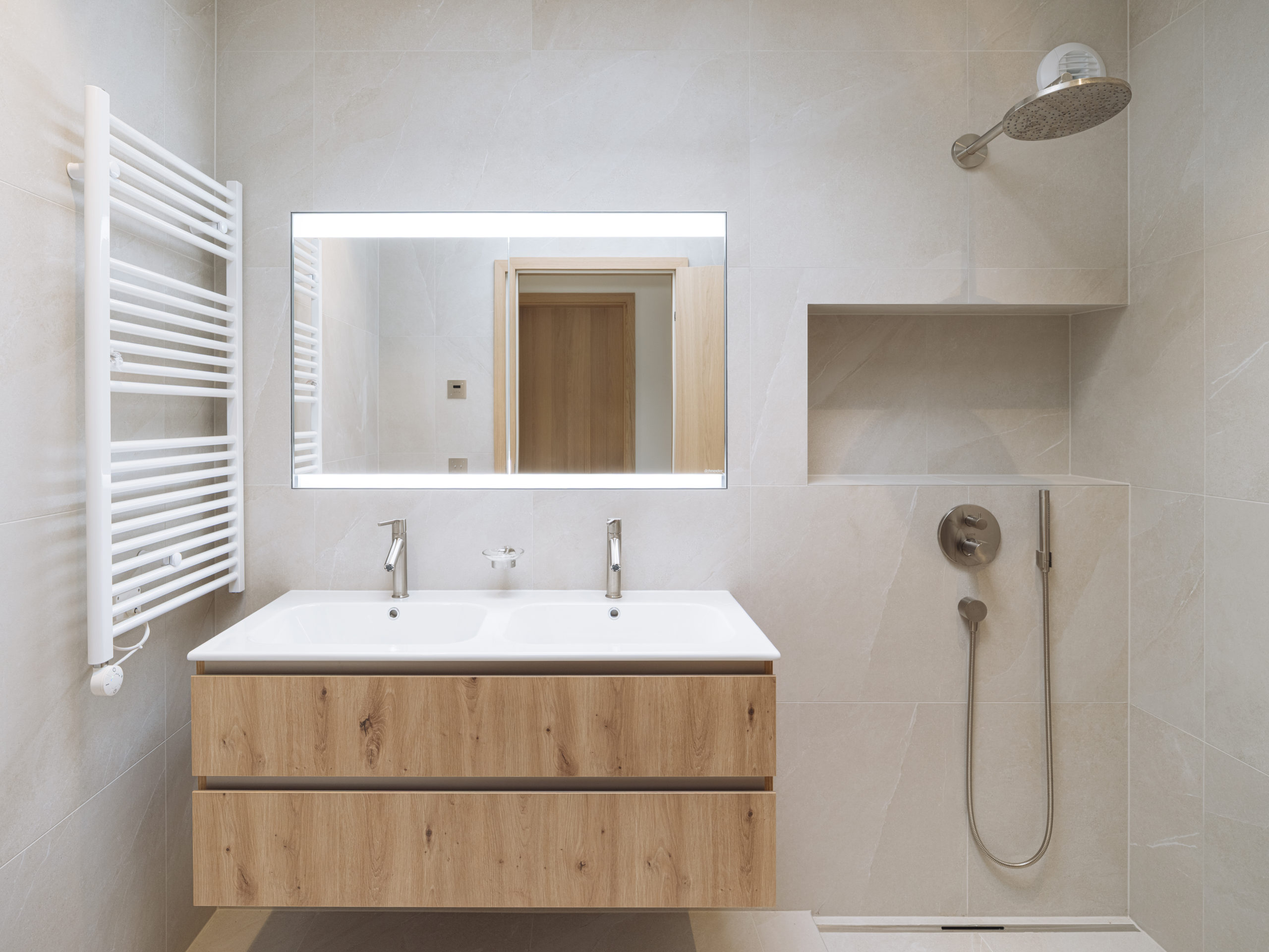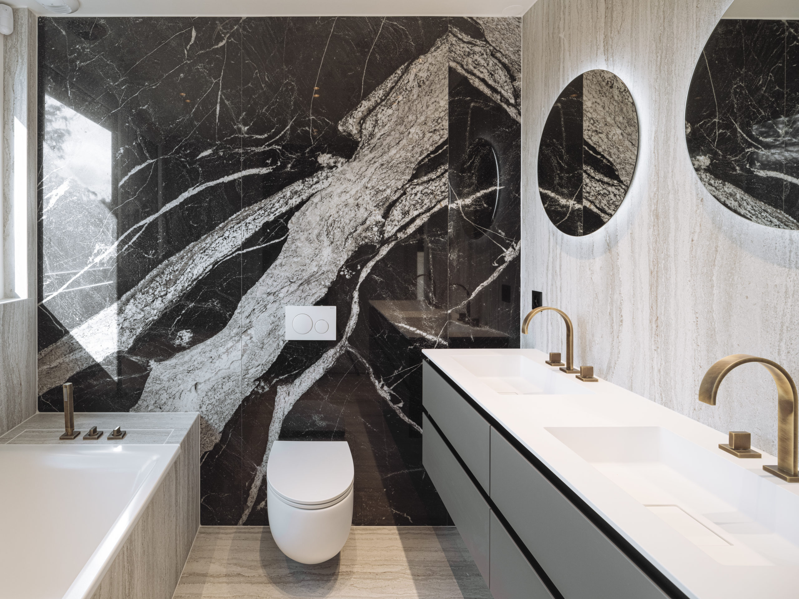 L’espace consacré aux enfants comprend 2 chambres à coucher avec accès à un balcon ainsi qu’une salle de bains avec double vasque, éclairée naturellement par une fenêtre de toit. La chambre parentale se compose d’un espace dressing, d’une grande salle de douche avec double vasque et douche à l’italienne et d’un balcon surplombant le jardin.
