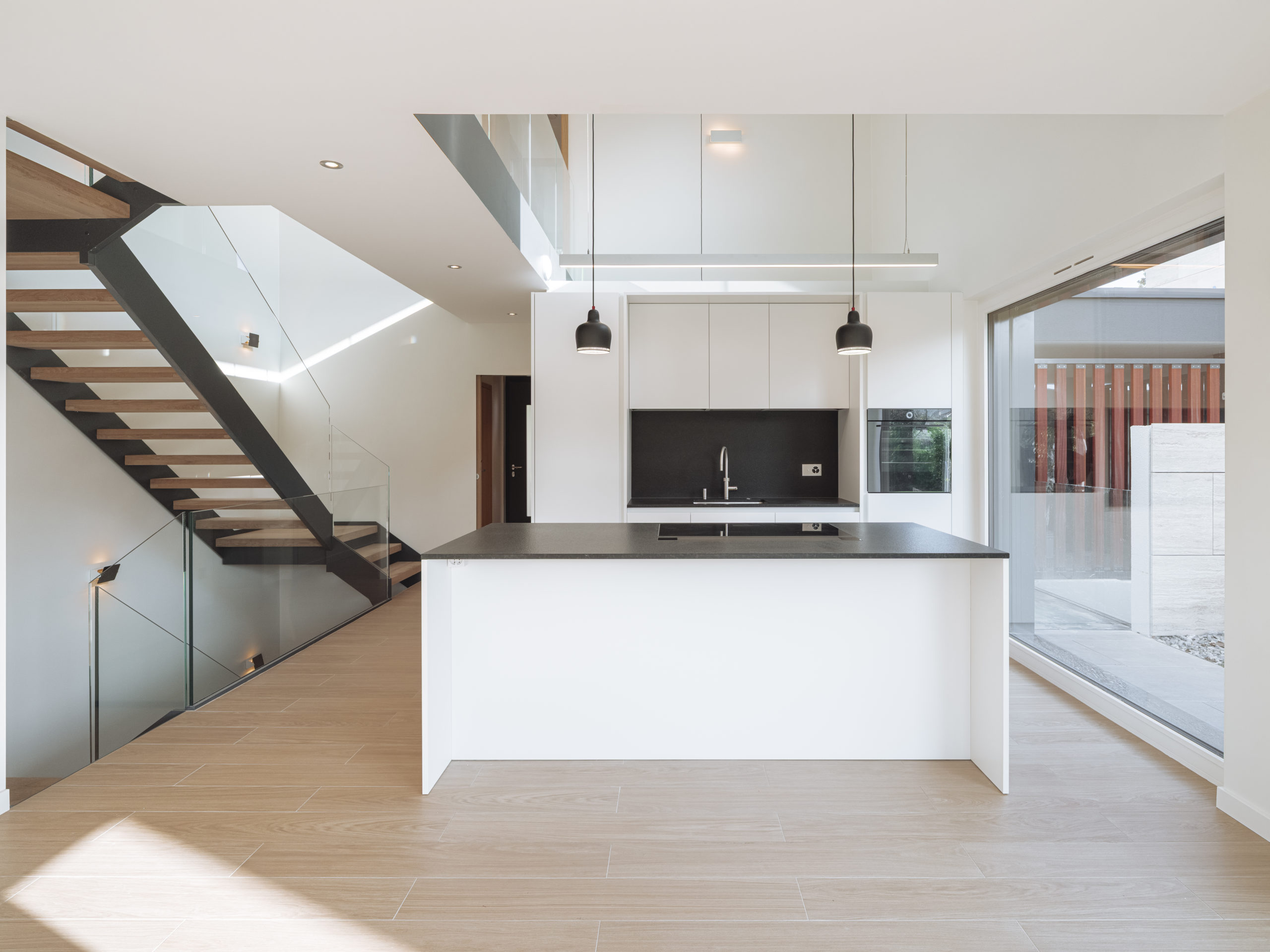 L’agencement des villas prévoit un rez-de-chaussée dédié à la convivialité, où une cuisine et son îlot spacieux s’ouvrent sur une grande pièce de vie (salon-salle à manger), prolongée par une terrasse et un jardin. Grâce à de larges baies vitrées affleurées au sol, l’intérieur se fond harmonieusement avec l’extérieur, créant un beau dégagement sur la nature environnante au calme absolu.