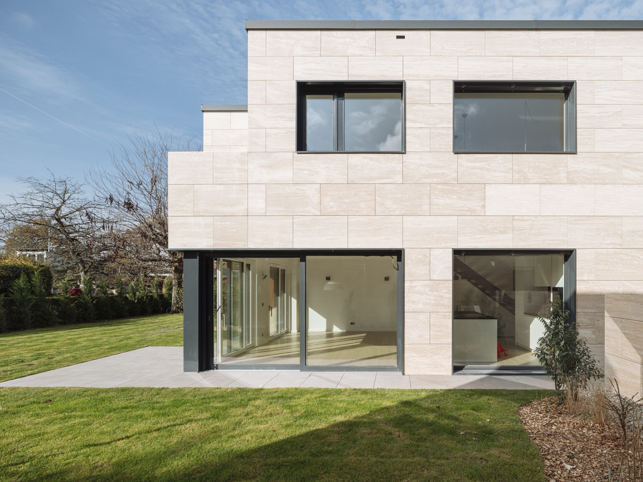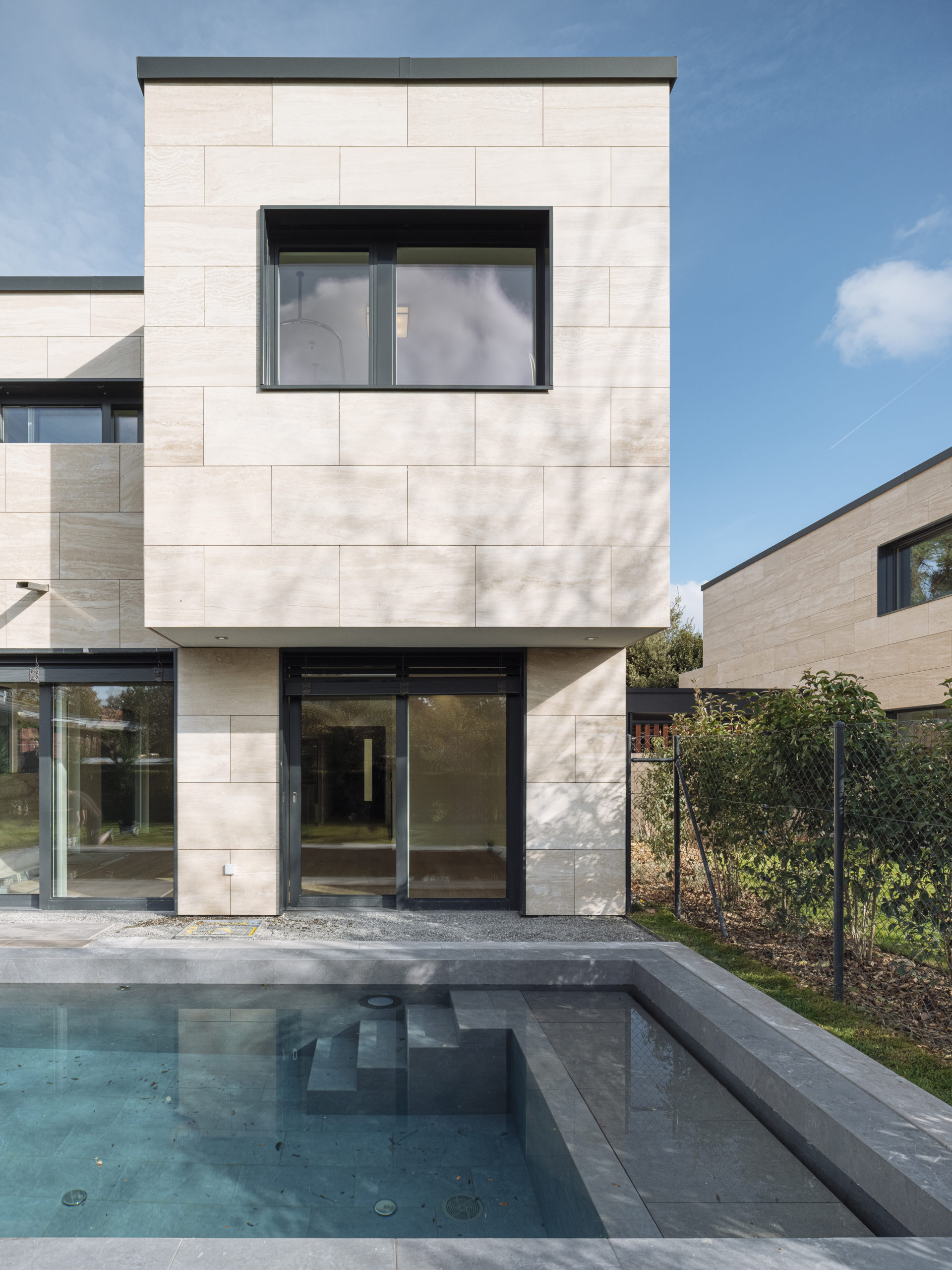 Signée par le bureau RIS + Partenaires Architectes, l’expression des villas est pensée de manière monolithique, en pierre naturelle de travertin travaillée dans la masse. Les façades sont ainsi rythmées par des jeux de redans, créant des balcons et des porte-à-faux flottants sur les entrées et les terrasses.